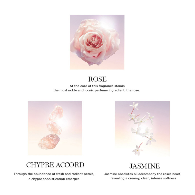 - إفتتاحية العطر الكمثري و البرغموت; قلب العطر الورد التركي, ورود دي ماي و الياسيمين الهندي; قاعدة العطر تتكون من المسك الأبيض و الفانيليا.