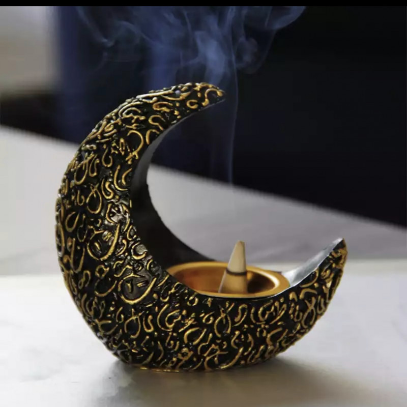 مبخره باللون الاسود والذهبي على شكل هلال رمضان بشكل صغير