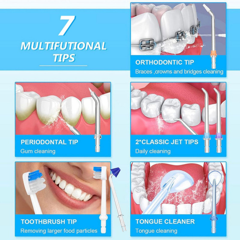 • يحتوي الجهاز على 7 رؤوس مختلفه وعلى 3 رأس لتنظيف اللثة و 2 رأس لخيط الأسنان العادي و 2رأس لتنظيف تقويم الأسنان لتناسب إحتياجك اليومي .